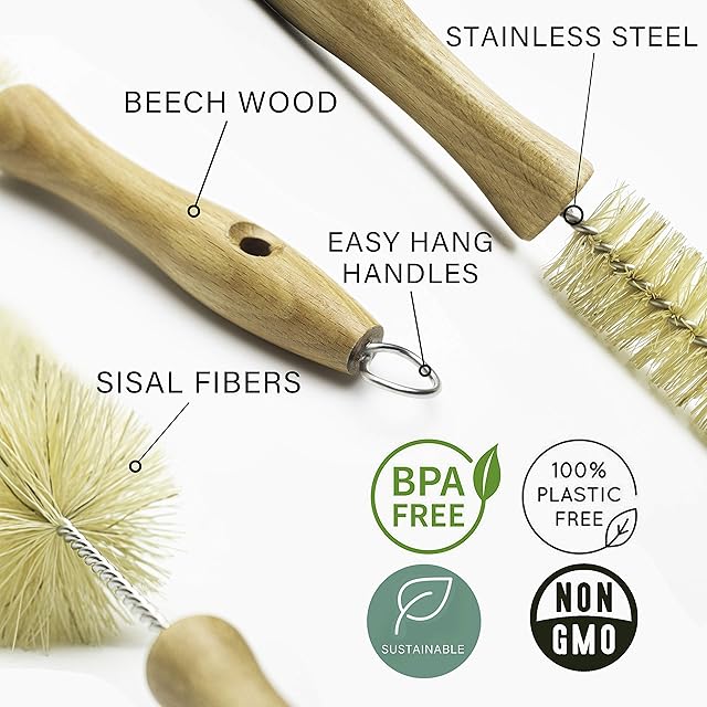 Gaia Guy クリーニングブラシセット(プラスチック・フリー)サイザル麻ブラシ+木製ハンドル)細首ボトル、スポーツ/ウォーターボトル、タンブラー、ケトルクリーニング用に 蓋ブラシ、ロング・ストロー・ブラシ付