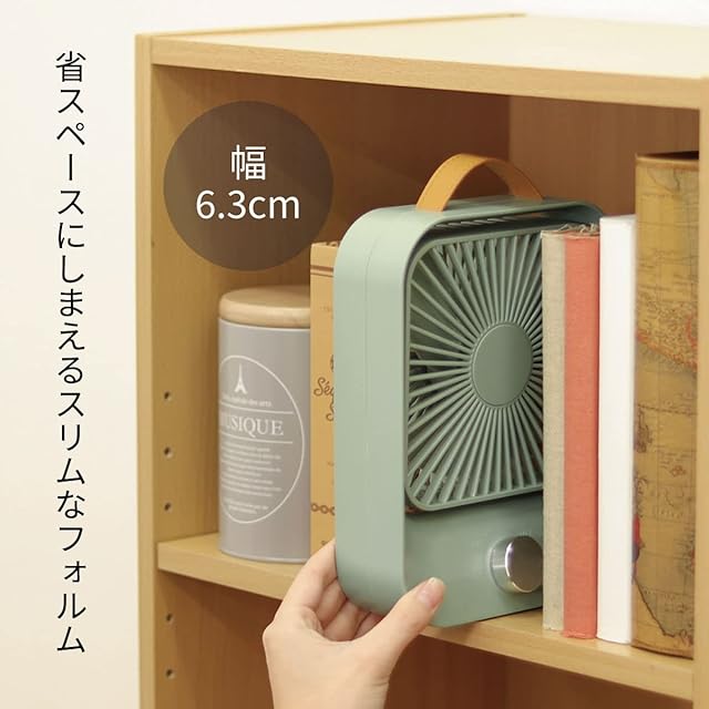 ファンの幅はたった6.3cm 省スペースにしまえるスリムなフォルム。持ち運びやすいハンドル付き さっと色々な所へ運べます。