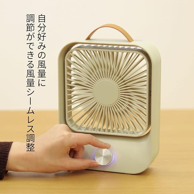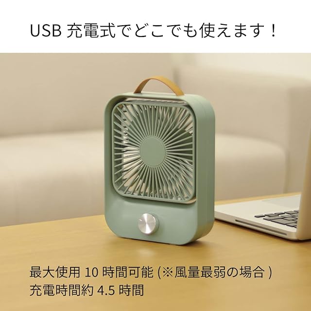USB充電式でどこでも使えます!最大使用10時間可能(※風量最弱の場合) 。充電時間約4.5時間。電源ダイヤル操作方法 反時計まわり:風量弱く、時計回り:風量強く、反時計まわりでカチッと音がするまで回すと電源OFF【電源】USB充電式