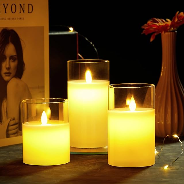 【商品仕様】サイズ:L(直径7.5cm×高さ15cm)、M (直径7.5cm×高さ12.5cm)、S(直径7.5cm×高さ10cm)、個数:3個/点灯モード:揺らぎ・一定 キャンドル本体の電池:単3電池(各2本・別売り) リモコン用電池:ボタン電池1個(付属)。省電力のLEDライトは電池が長持ちするため、ゆっくりと光を楽しむことが可能です。