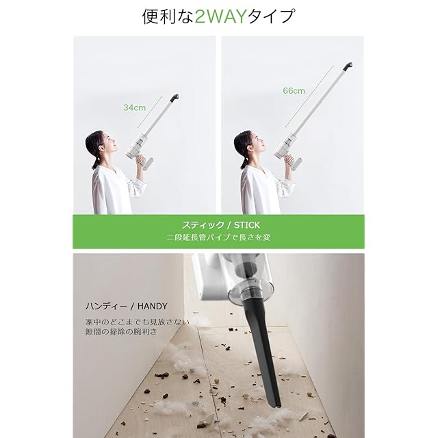 ★【0.6kg超軽量&2wayデザイン】わずか0.6kgの超軽量設計で、ハンディクリーナーとスティッククリーナーの2way仕様。家具の隙間、階段、床、カーペットなどを簡単に掃除できます。延長パイプにより、高い場所から床まで柔軟に掃除できます。軽量設計とワンボタン操作により、高齢者でも簡単に使えます。ハンディ掃除機、スティック掃除機の両方の利便性を提供します。