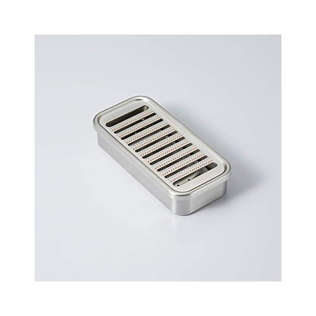 従来の箱型のおろし金の持ち手を無くし、よりコンパクトにしたタイプです。コンパクトでありながら、通常の大根(70mm程度)の幅は確保。おろしが受け箱に落ちやすい改良も加えてます。また、収納時にストレーナーをふたとして使えるため、刃先を保護できます。