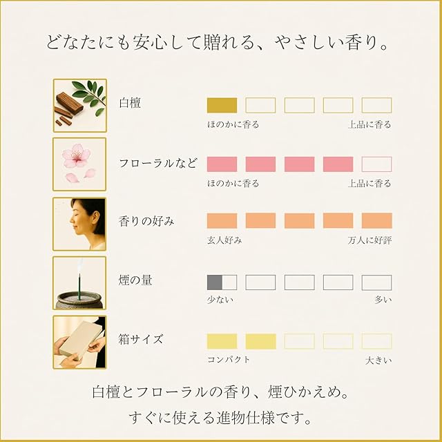 ■ 香りと品質の特長 ・香司(全国に14名のみ)による特別調香 ・白檀とフローラル天然香料を調合したやさしい香り ・煙が少なく、お部屋の空気を汚しにくい設計