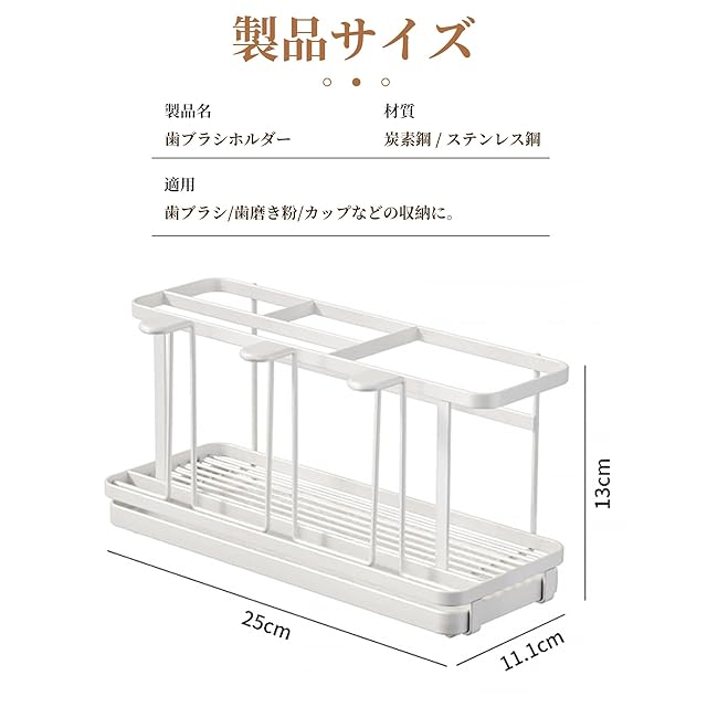マルチスロット·コップスタンドデザイン、効率的な収納:製品サイズは25×11.1×13cmです。この歯ブラシホルダーはマルチスロットデザインを採用しており、通常の手動歯ブラシでも電動歯ブラシでも、複数の歯ブラシと歯磨き粉を同時に収容でき、簡単に配置できます。歯磨き粉やカミソリなども入れられます。側面には3つのカップハンガーがあり、使用後はカップハンガーに逆さまに置くことができるため、保管スペースを節約できるだけでなく、カップを素早く自然乾燥させて衛生的に保つことができます。
