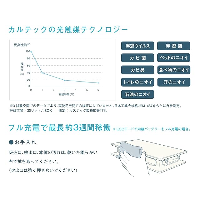 ・キレイな空気をいつでも、どこでも.・ニオイがこもる、狭い空間におすすめ!・気になるところに置くだけ! ・脱臭・除菌力がちがう光触媒技術 ・フル充電で最長約3週間稼働!