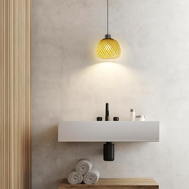 竹編みライトシェードを使用してペンダントライトを飾り、家具スタイルに合った新しい外観になります。