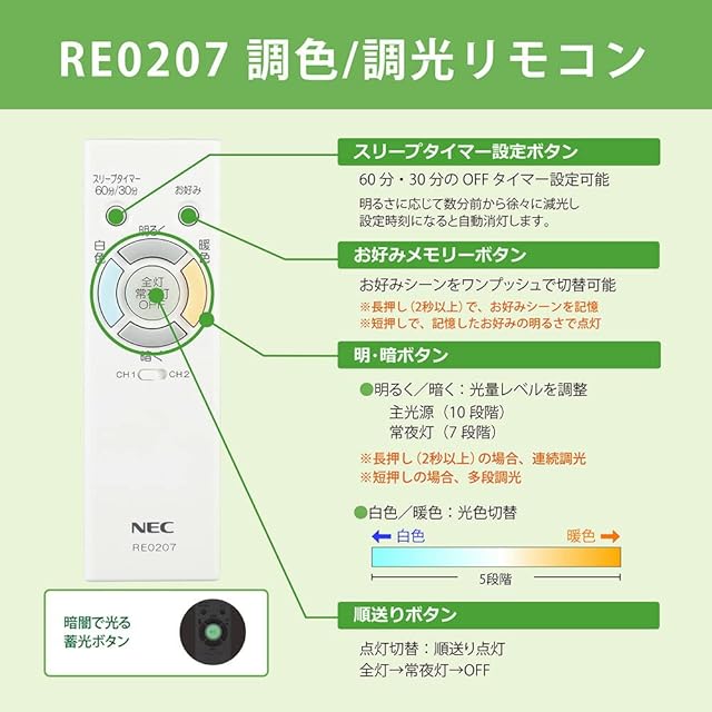 メーカー: ホタルクス / HotaluX (旧NECライティング)<br/> シリーズ名:シーリングライト用リモコン <br/> ブランド名はNECからHotaluXへ順次変更となります。<br/> 電池(単三形乾電池 2本)は別売です。必ず本体品番(対象商品品番)をご確認ください。 主なボタン操作 調色:「白色」/「暖色」 調光:「▲(明)」「▼(暗)」(連続調光:100%~約10%、多段調光:10段階) スリープタイマー(60分/30分)、お好みメモリー、常夜灯 照明点灯/消灯:点灯、消灯 対象本体品番 HLDCB08101、HLDCB08104、HLDCB08105、HLDCD12101、HLDCD12104、HLDCD12105、SLDCA06592、SLDCB08592、SLDCD12569、SLDCD12592、SLDCKB08577SG、SLDCKD12577SG、HLDCKB0877SG、HLDCKD1277SG、HLDCKE1477SG、HLDCB0873、HLDCB0892、HLDCD1273、HLDCD1292、SLDCA06569、SLDCB08569、HLDCA0673、HLDCB0876、HLDCD1276、HLDCA0661、HLDCB0861SG、HLDCB0862SG、HLDCD1261SG、HLDCD1262SG、HLDCD12MX2 関連キーワード 照明 天井照明 天井灯 シーリング ライト ※他の商品と同梱できません ※沖縄・離島は設定が異なります。