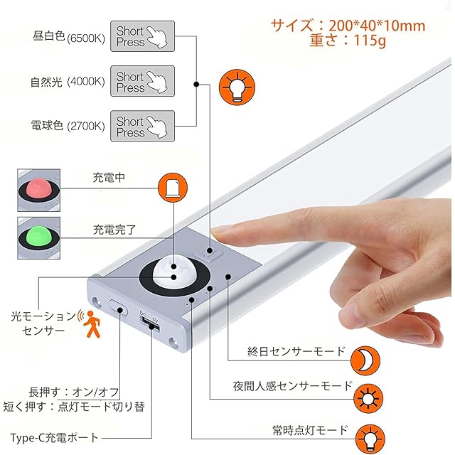 商品名:LEDバーライト 人感センサー 超薄型設計【リモコン付き 3つ色温度 10段階明るさ調節 タイマー機能】 Type-C 充電式 LEDセンサーライト 屋内 室内 マグネット 簡単取り付け バー/足元灯/階段ライト 省エネ 20CM 3個セット
