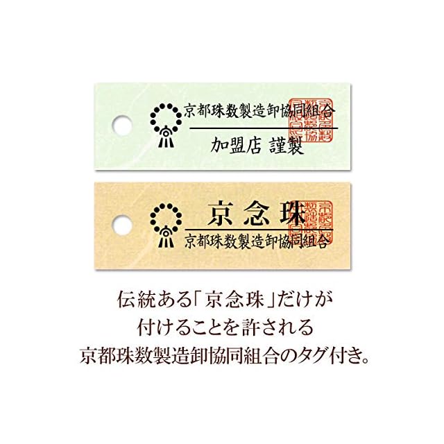 房は2色の紐を組み上げた、上品な正絹紐房を使用しております。伝統ある「京念珠」だけが付けることを許される京都珠数製造卸協同組合のタグ付き。京念珠製造師が匠の技で仕立てた逸品でございます。