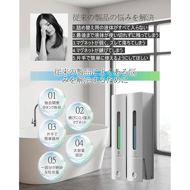 各400MLの5つのチャンバーに、シャンプー、ボディソープ、コンディショナーを分けて収納可能。コンパクトなデザインでバスルームのスペースを効率的に利用し、清潔感を保ちます