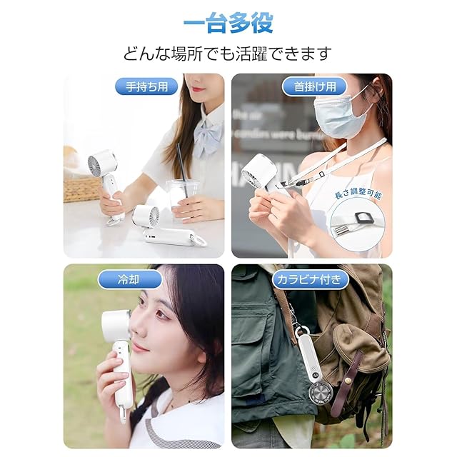 【ストラップ付き・カラビナ付き、首掛け・卓上として使用可能】本品はストラップが付属しています。さらに扇風機のヘッド部は90°調整可能で、首掛け扇風機または卓上扇風機として使用することが可能です。カラビナ付きで、カバンなどに掛けることが可能で、収納が便利です。