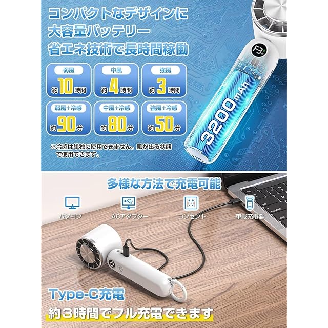 【メーカーによる一年安心保障】メーカーから一年間の商品を提供します。商品について何かありましたら、いつでもメーカーサポートセンターにご連絡ください。パッケージ内容:扇風機本体×1、ストラップ×1、充電ケーブル×1、取扱説明書×1