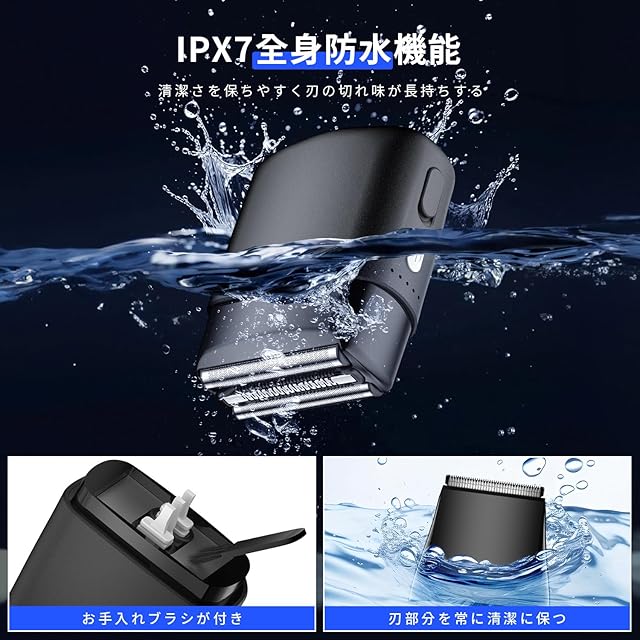 【IPX7全身防水設計&乾湿両用】IPX7基準の100%防水設計でシャワー中でも使用可能で、ドライシェービングにもウェットシェービングにも対応します。お手入れ用ブラシが付属しているうえに丸ごと水洗い可能で、シェーバー メンズ のヘッド内部に溜まる髭くずを払い落としてから水で洗い流せるため、清潔に保ちやすく刃の切れ味が長持ちします。c