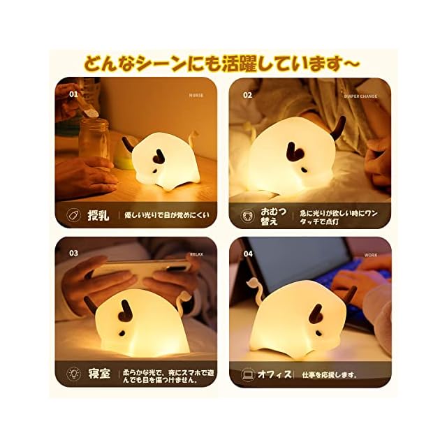 商品名:デスクライト ナイトライト ウシ LED ランプ 牛 うし 授乳ライト 照明 テーブルランプ 寝室 卓上 子供部屋 おやすみライト 無段階調光 間接照明 シリコン 目に優しい おしゃれ USB充電式 枕元 ライト 出産祝い 誕生日 プレゼント