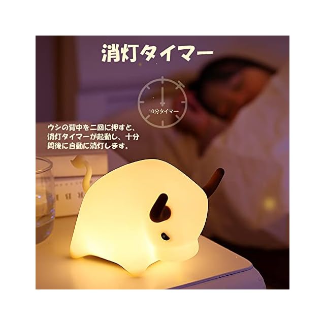 【無段階輝度調節・消灯タイマー】柔らかい光のテーブルライトとして、無段階輝度調節の機能があります。明るさ記憶機能が付きますので、消灯の明るさは記憶され、次に点灯したときは、記憶された明るさで点灯します。また、消灯タイマー機能付きで、ウシの背中を二回に押すと、消灯タイマーは起動し、十分間後に自動に消灯します。