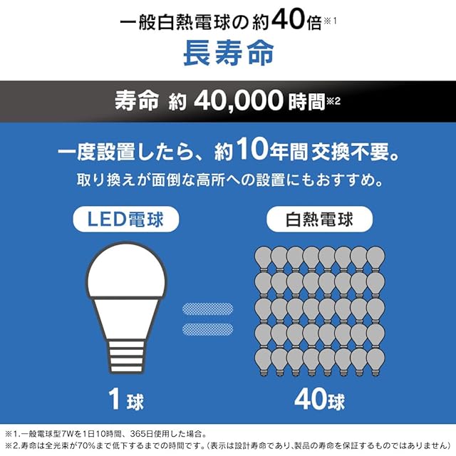 設計寿命:約40000時間 ※寿命は全光束が70%まで低下するまでの時間です。表示は設計寿命であり、製品の寿命をするものではありません。