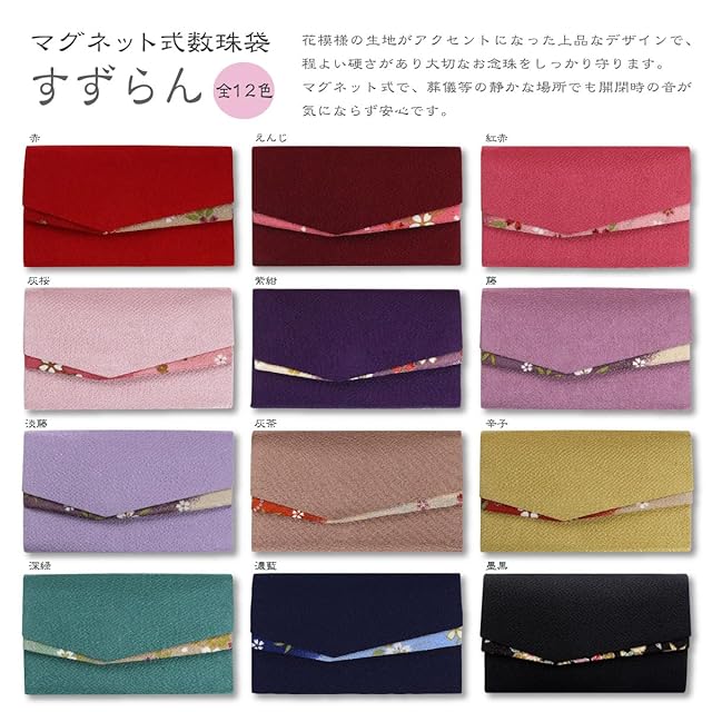 ●本体サイズ:約16cm×10cm<br> ●素材/表:レーヨン100%、裏:綿100%<br> ●さりげない花柄の縁取りが上品な印象です。<br> ●留め具はマグネットホックを使用しておりますので、静かな場所でも音をたてることなく開け閉めができます。<br> ●中仕切りがついているのでハンカチや名刺など小物を入れることができます。<br> ●画像に掲載の数珠はサイズ比較の参考です。お届けする商品に含まれません。