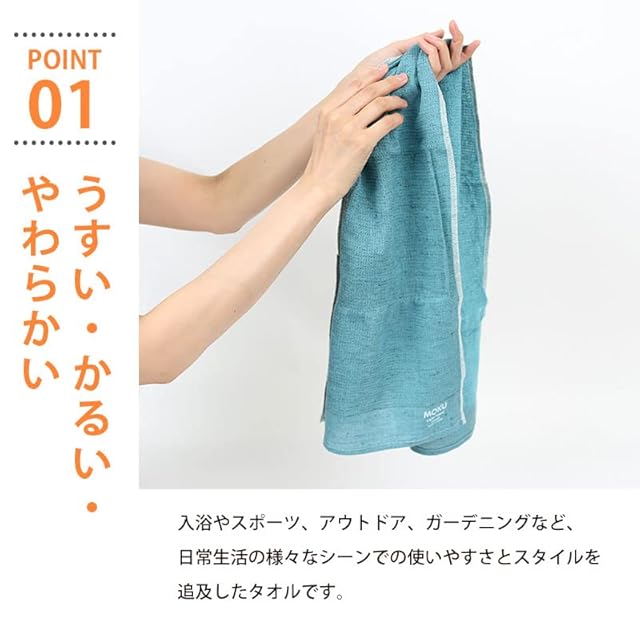 先染めの糸を使用して織り上げ、生地の上から染め加工を施しています。ところどころに顔を覗かせるネップが個性的な色味をさらに表情豊かにしてくれます。少し長めで薄く、吸水、速乾性に優れ、使い心地がとてもいい。大変な手間と時間を必要とした「着色抜染技法」と言われる染色方法を用いるなど、MOKUは伝統の技にもこだわり抜き、使いやすさとかっこ良さを追求したタオルです。<br><br>サイズ:60×120cm<br>素材:COTTON 100%<br>生産地:日本/愛媛