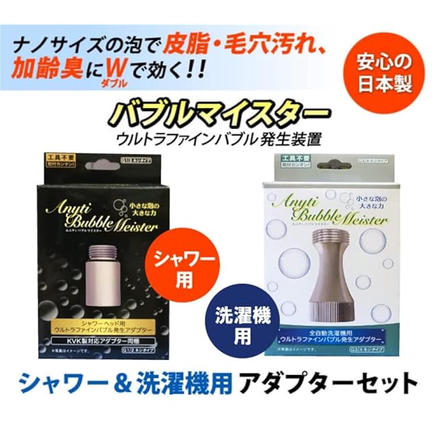 富士計器 (泡発生装置) バブルマイスター ウルトラファインバブル発生装置 ★シャワー用&洗濯機用 セット バブルマイスターシャワー用 ナノサイズの泡で皮脂・毛穴汚れ、加齢臭に効く! バブルマイスターは毛穴よりも小さいナノサイズの泡(ウルトラファインバブル)を発生させ、皮脂や毛穴汚れをすっきりと取り除くことができる工事不要のシャワー用アダプターです。 通常の泡に比べて約2万分の1という極小サイズの泡が毛穴の間に入り込み、汚れや臭いの元をかき出し、お肌の健康を保つことができます。 また、極小の泡は温浴効果も見込めるため、手足の冷え対策にもおすすめです。 型番/BS-02 本体寸法/(約)直径2.5×高さ4cm 重量/(約)75g 本体材質/(クロームメッキ) プレート材質/ポリプロピレン パッキン/NBR 生産国/日本 バブルマイスター洗濯機用 ナノサイズの泡が皮脂汚れ、黄ばみ防止に効く! バブルマイスターは毛穴よりも小さいナノサイズの泡(ウルトラファインバブル)を発生させ、皮脂汚れや臭いの元など、洗濯物の汚れを落としやすくする洗濯機用のアダプターです。 通常の泡に比べて約2万分の1という極小サイズの泡が繊維の間に入り込み、汚れや臭いの元をかき出し、衣類を清潔に保つことができます。 また、極小の泡は洗濯槽の汚れ残り・洗剤残り・ヌメリ・黒カビを洗濯するたびに除去するので、洗濯機も綺麗に保つことができます。 型番/BS-01 本体寸法/(約)直径3×高さ6cm 重量/(約)156g 本体材質/真鍮(クロームメッキ) プレート材質/ポリプロピレン パッキン/NBR 生産国/日本