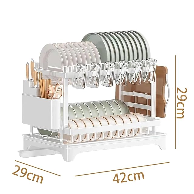 【2段式食器乾燥ラック】ラック本体サイズ:42X30X29CM、耐荷重:25kg、2段式のデザインを採用された、同じスペースのままグっと容量が増えます、包丁やまな板を収納できるスペースもあり、大容量で充実した水切りラック。