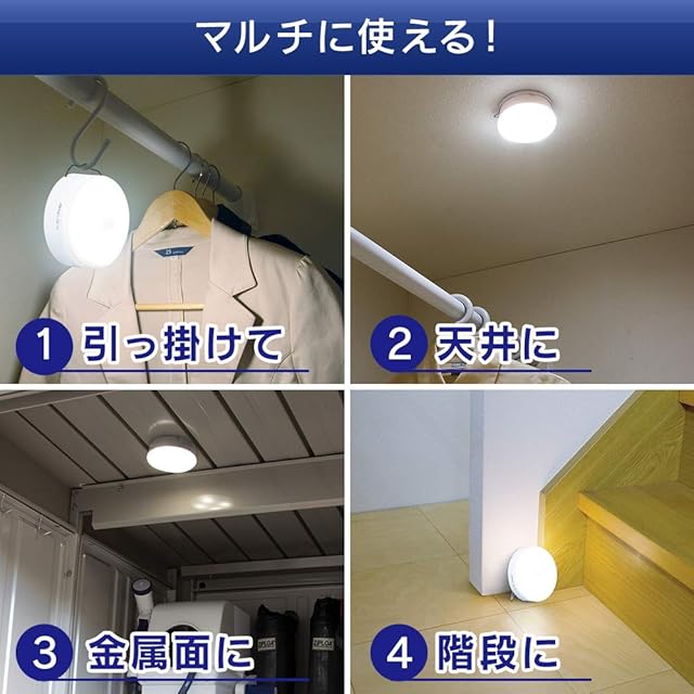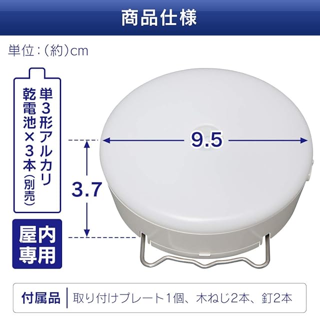 本体サイズ:直径約9.5×高さ約3.7cm、取付プレート:直径約9.1×高さ約0.7cm※両面テープ除く 本体重量(電池除く):約103g、取り付けプレート(両面テープ除く):約20g 光源:0.5W-LED×4個 全光束(明るさ)ON:約40lm、AUTO Hi:約40lm、AUTO Lo:約12lm 感知センサー:赤外線受動式センサー 明暗センサー:フォトセンサー