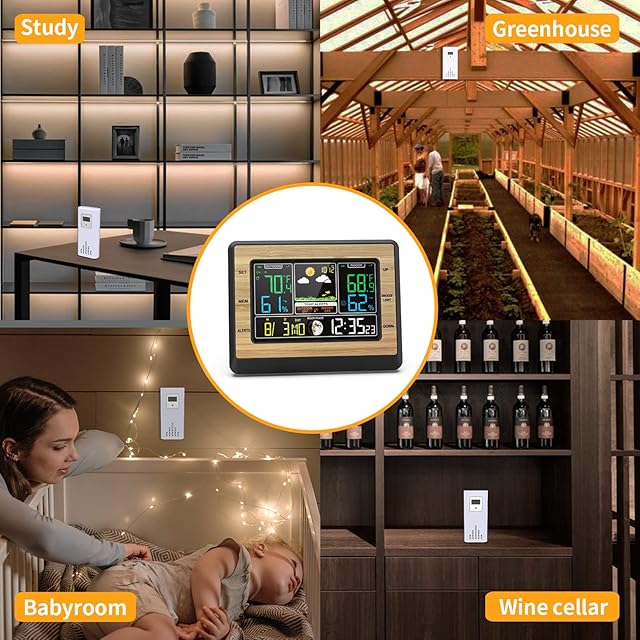 ウェザーステーション、屋内屋外温度計、6インチカラースクリーン天気予報付き天気温度計温度湿度時間日付月相表示温度アラーム