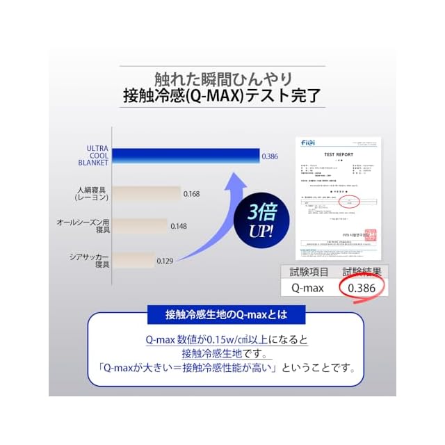 ✅優れた接触冷感性:人がモノに触れたときに冷たいと感じる感覚を『接触冷感』といい、接触冷感の値をQ-maxといいます。一般的にQ-maxが0.15w/cm2以上になると接触冷感性のある生地であると言えます。ウルトラ・クール・ブランケットは、この接触冷感に優れた生地で作られたブランケットです。 主要な寝具生地とウルトラ・クール・ブランケットの接触冷感試験を行った結果、接触冷感の値(Q-max)の差は歴然。シアサッカー寝具と比べると約3倍もの差があるという結果がでています。 このことからも、ウルトラ・クール・ブランケットの接触冷感性に優れていることが分かります。