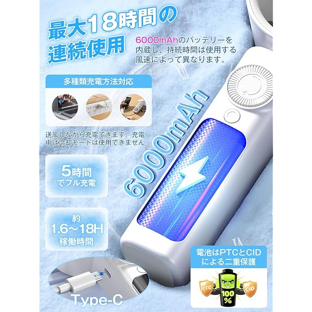 【6000mAh大容量とType-C急速充電】6000mAhのリチウムイオンバッテリーを搭載し、長時間の連続使用が可能。Type-Cポート対応でスマートフォンと同じ充電器を使え、PCやモバイルバッテリーからも充電できます。フル充電後は通勤やキャンプなど、外出先でも電源切れの心配がありません。充電時は付属の5V/2A対応アダプターの使用を推奨し、フル充電まで約5時間を要します。充電時は「ファンモード」のみで、風量は最大60段階に制限されています。充電中はクーリングモードは使用できません。