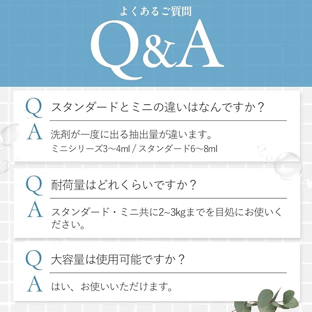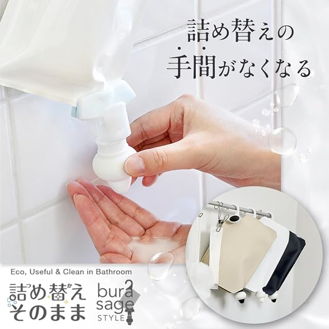 【注意】 ポンプのみの商品となりますので、ホルダーは別売りです。 今まで面倒だった詰め替え作業がなくなりました。 詰め替えパックを簡単セットするだけでそのまま使えます。 シャンプーリンスなどの詰め替えパックに取り付けることで使用することができます。 逆止弁構造で、空気の逆流を防ぎ酸化防止になります。 真空状態を保つことで、雑菌の繁殖を防ぎます。 ぶら下げて使うことで、最後の最後まで洗剤を使えます。 ■特長 ・ホルダーとポンプを詰め替えパックにセットするだけで、そのまま使用できます。 ・今まで面倒だった詰め替え作業がないので、取り付けたらそのままサッと使用できます。 ・ボトルを使わなくてすむので、お風呂場がスッキリします。 ・詰め替えの手間(洗浄・乾燥・補充)がない。 ・取り付け、取り外しは、簡単ワンタッチ。・片手で適量が抽出でき、赤ちゃんとの入浴時にも便利です。 ■使用方法 (1)詰め替え用パックの出口を1.5〜2cmの幅になるようにカットします。 (2)レバーを開いたポンプを根元までしっかり差し込んでください。 (3)レバーを閉じて固定します。 (4)ホルダーのスライダーを手前に引き、詰め替えパックの端をはさんで 再びスライダーを押して固定して吊るすだけ。 (5)ポンプを押して使用できます。 ■ポンプのクリーニング方法 ・中身が出にくくなった場合はリセットピンを爪先で軽く引きます。 ・別の中身に詰め替える場合はクリップ部をポンプから外し、ぬるま湯の中で数回押して洗います。 ■ご注意 ・本品の破損防止の為、本来の用途以外に使用しないで下さい。 ・クリップ部で詰め替えパック以外のものを挟まないで下さい。 ・詰め替えパックの材質、厚み、形状が特殊な場合クリップ部とスキが生じ中身が漏れることがあります。 ・ポンプをセットした後のパックには、無理な圧力をかけないで下さい。 ・ホルダーに取り付けた詰め替えパックには、無理な荷重をかけないで下さい。 ・床に落とすと、本体が破損する場合があります。 ・幼児の手の届かない所に保管して下さい。 ※本製品をご使用になれない詰め替えパックが一部あります。 ※ご購入の際は、ご使用予定の詰め替えパックの形状をご確認ください。 ご使用になれない詰め替えパック (1)注ぎ口をカットした際、開口部が20mm以上になる詰め替えパック。 (2)材質や厚みが通常と大きく異なる詰め替えパック。 (3)注ぎ口が凹凸形状の詰め替えパック。 ■よくある質問■ ミニシリーズとスタンダードシリーズとの違いについて ■抽出量が違います ミニシリーズは3~4ml スタンダードは5~6ml ■洗剤パックの固定方法が違います ミニシリーズはニードルで詰め替えパックに刺して固定します。 スタンダードはSUSのギザギザローラーで詰め替えパックを挟んで固定します。