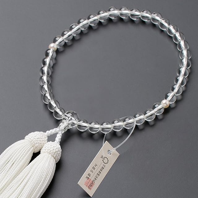 滝田商店ブランド品質の証である滝田商店発行「証明書」付き。<br><br>すべての宗派でお使いいただける女性用の念珠です。<br>本水晶の7mm玉を使用しました。<br>正絹の頭付房がついています。<br>数珠袋(数珠入れ)をお付け致します。<br>数珠は桐箱に入れてお届けします。<br><br>水晶はクリスタルとも呼ばれ、無色透明の神秘的な石で、古くから魔除けになると言い伝えられてきました。<br>日本の国石(象徴石)でもあり、仏教でいう七宝のひとつに数えられています。<br>水晶には魔を払いすべてを浄化し、幸運を招く力があるとされています。<br><br>本真珠はクレオパトラが好んで持ち、美を保っていたという伝説があるなど、古来より女性の美のお守りとして使用されてきたといわれています。<br>強い保護力で悪いものから持つ人の身を守ってくれる力があるとされています。<br><br>房は京都の伝統工芸である「京房ひも」の職人が製作した正絹頭付房を使用しております。<br>京房ひも職人が作った証しであるシリアルナンバーをお付け致します。<br><br>◆数珠袋(念珠入れ)をお付け致します◆<br>高級ちりめん わすれなぐさ色/サイズ:縦9.5cm×横15cm/留め具:マジックテープ<br>高級ちりめんで作られたシンプルな数珠袋です。<br>大切なお数珠を携帯するのに便利です。<br><br>数珠は合掌する手にかけ、仏さまと心を通い合わせる大切な仏具で、仏事には忘れてはならない必需品です。