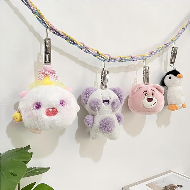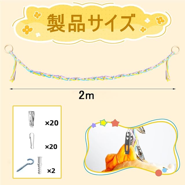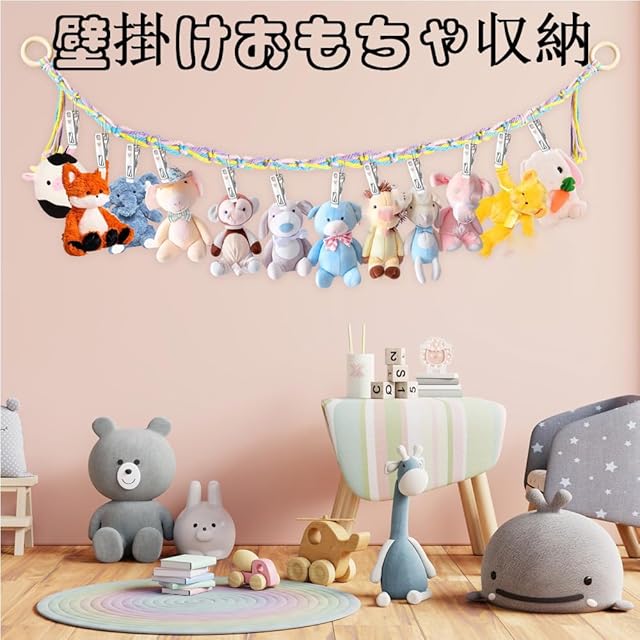【商品仕様】セット内容:2mの綿ロープ*1 金属クリップ*20 壁掛けフック*2。吊り下げ式のぬいぐるみ収納は、お子様の寝室に自由奔放な装飾スタイルを与え、ご自宅をより快適にします。