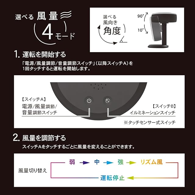 【商品仕様】</br> ◇本体サイズ:W135×H178×D110mm</br> ◇本体重量:約320g(USBケーブル除く)</br> ◇主要材質:ABS樹脂</br> ◇電源:USB電源(DC5V/1.8A)</br> ◇消費電力:約1W~10W(最大)</br> ◇風量調節:3段階調節(弱・中・強)+リズム風切り替え</br> ◇角度調節:角度調節</br> ◇羽根サイズ:直径10cm(5枚羽根)</br> ◇付属品:U Bケーブル( USB-A⇒USB-C/約1m)、取扱説明書(1年書付き)</br> ◇TOPLANDオフィシャルストアでのお買い上げで、期間が24ヶ月となり、通常より12ヶ月の延長となります。</br> ◇商品購入後のサポートが充実しています。TOPLANDお客様センターは平日9時~17時までお電話の受付が可能です。メールでの受付も可能です。
