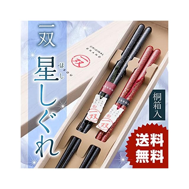 長さ:男性用23.0cm 女性用20.5cm<br>塗装:上部:ポリエステル 下部:漆下部漆塗り<br>木地:天然木(箸先スベリ止め加工)<br><br>満点の星空からあたかも星がしぐれて降ってきそうな<br>そんな広大な宇宙を<br>感じるさせてくれる珍しいお箸です。<br>どこまでも広がる星空を、どうぞこのお箸から想像して<br>宇宙の神秘とロマンをお感じになって下さい!<br><br>夫婦箸を桐箱に入れてご用意しました。<br> このお箸は伝統技法に現代的 デザインを取り入れました。<br> 夫婦箸は結婚祝いの贈り物に最適です。