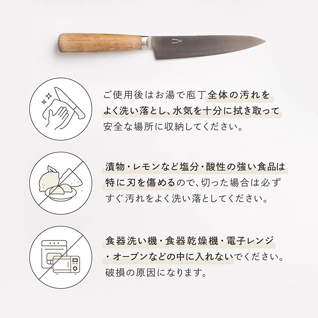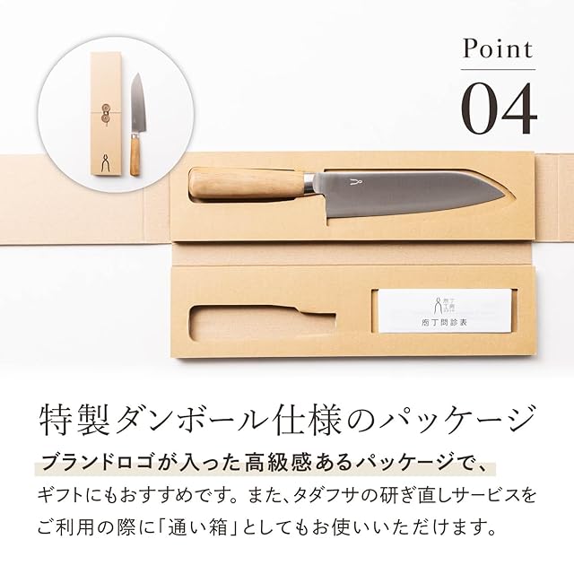 備考 紙箱入り【お手入れについて】「庖丁工房タダフサ」の庖丁は、オールステンレスの庖丁に比べ、鋭い切れ味をお楽しみいただける分、普段の手入れに少々注意が必要となります。切れ刃には鋼(SLD鋼)を採用しているため、手入れや保管環境によって錆びが発生する場合があります。手入れや保管環境によっては、一晩でも錆びが発生することもあります。心地よい切れ味とともに、お手入れや研ぎ直しもあわせてお楽しみください。庖丁の箱の中に取扱説明書を兼ねた「庖丁問診表」が入っています。(詳しい研ぎ直しのご依頼方法や連絡先等は付属の「庖丁問診表」に記載がございます。)