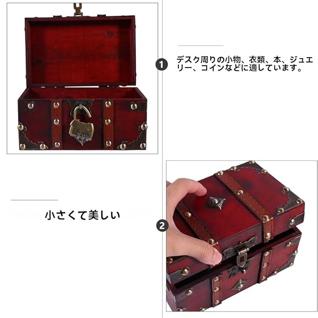 <p>宝箱の形をした、アンティーク感あふれる木の風合いがとてもおしゃれな宝箱です。レトロ感がよく演出できます。<br>お部屋やお店のインテリア 置物としてだけでなく、大切な人への贈り物を入れて、絶対に彼らに喜びさせます。<br>宝石、輪、リング、ピアス、イヤリングなどさまざまな小物をー類収納にとても便利の宝箱です。<br>南京錠と鍵が付き、お札や小銭が保存できる貯金箱としてもお使い頂けます。オシャレな宝箱です。<br><br><br><br>- 色: ダークレッド。<br>- 素材: 木。<br>- サイズ: 約 18.00 X 11.50 X 10.50 cm/7.07X4.52X4.13 インチ。&p;<br><strong>- 商品含む:</strong><br>1×レトロ宝箱;<br>1×コードロック。</p>