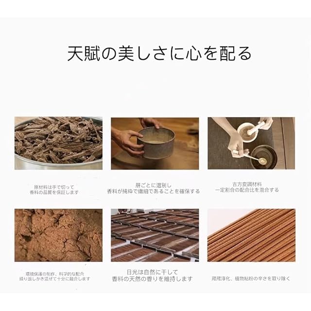 1. 製造工程 厳選されたマレー香を粉末状にしています。原木を粉末化しているので、原木の風味が生きています。その後、粉末をふるいにかけ最高品質で粉末の粒度を均一化させています。 2. 粉末状のお香成分が85%、繋ぎ成分が25%配合されています。お香の製造には汚染されていない、山の湧水を使用しています。製造後は日当たりの良い場所において乾燥させてから回収します。3. 手作業と最新設備を組み合わせて製造しています。各生産過程に細心の注意を払い、商品の品質とサービスを提供します。。