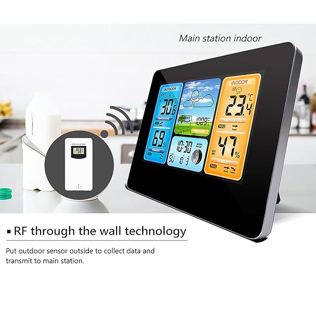 1:6.6 インチ LCD スクリーンウェザーステーション:大型カラーディスプレイを備えた 温度および湿度モニター。包括的な情報を表示します。屋内外温度湿度 (最高/最低、高/最低)、カスタマイズ可能なアラート、時刻/日付、目覚まし時計/スヌーズ、天気予報ムーンフェイズ、気圧新しいデジタル予測、効率的かつ正確、6 つの天気表示、温度と湿度の効率的で高感度な表示。