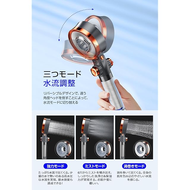 【3段階出水モード+多角度調節可】◆ ミストモード:水流を微細な水滴に分散します。◆ 渦巻きモード:水流が渦巻き状になります。◆強力モード:高水圧の水流を提供します。以上の3つのモードは水圧ヘッドを押すだけで自由に切り替えることができます。また、シャワーヘッドは自分の好みの角度に調整でき、より快適的なシャワー体験を提供します。