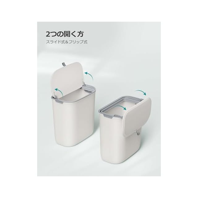 【スライド式&フリップ式】2つの開く方法があり、ご都合によりお好きなパータンを利用できます。フタが90度開ける大口径で、調理中に出る生ごみをササっと捨てられます。密封性にも優れているのでごみの嫌な臭いも漏れにくい蓋付きゴミ箱です。