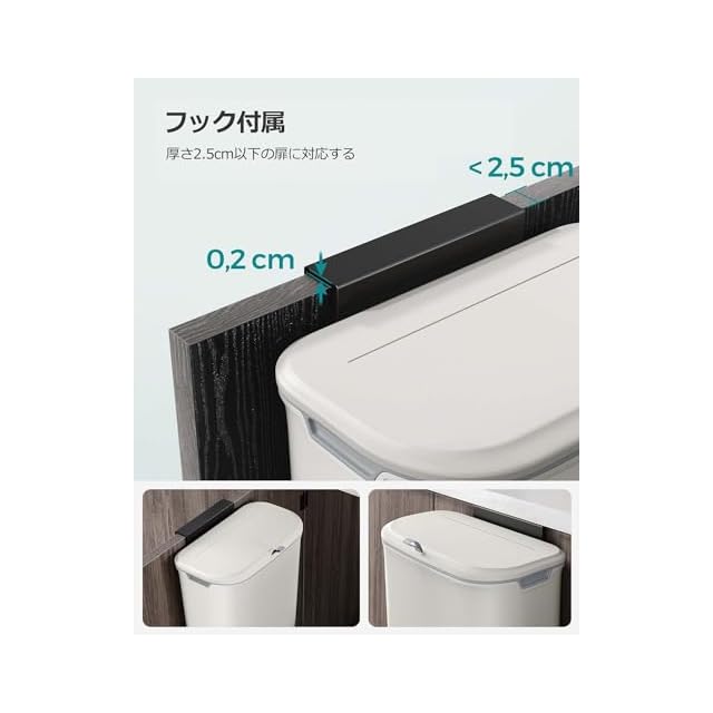 便利なコンポストコレクション </br>このゴミ箱をキャビネットのドアに掛けることで、食べ物のくずをかがむことなく簡単に捨てることができます。 2.4ガロンの容量は十分なスペースを提供し、屋外で堆肥化する前に有機性廃棄物を収集して封じ込めることができます。 </br></br>このハンギングゴミ箱のその他の特徴: </br>- フリップアップ&スライドダウン蓋: ふたを2つの方法で開けると、キッチンの作業が異なります。 </br>- ドア吊り下げ&壁掛け: キャビネットフックと粘着フックの両方が付属しており、キャビネットのドアに掛けたり、壁に貼り付けたりすることができます。 </br>- 多用途: シンクの下、カウンタートップ、床、浴室で使用できます。 </br></br>仕様: </br>- 色:ホワイト。 </br>- 材質:ポリプロピレンプラスチック。 </br>- 製品サイズ: 長さ10.2インチ x 幅5.9インチ x 高さ11インチ (26 x 15 x 28cm)。 </br>- 蓋を開けた状態での高さ:15.7インチ (40cm)。 </br>- 容量:2.4ガロン(9L)。 </br>- 製品重量:0.7kg </br></br>【パッケージ内容】 </br>- ゴミ箱1個。 </br>- キャビネットフック x 1。 </br>- 粘着フック x 1。 </br></br>SONGMICSノート: </br>- この容器は屋内での使用のみを目的としています。 </br>- 水で洗い流し、必要に応じて中性洗剤を使用してください。 </br>- ビンを吊るすためのキャビネットドアは1インチ以下の厚さでなければなりません。 </br></br>