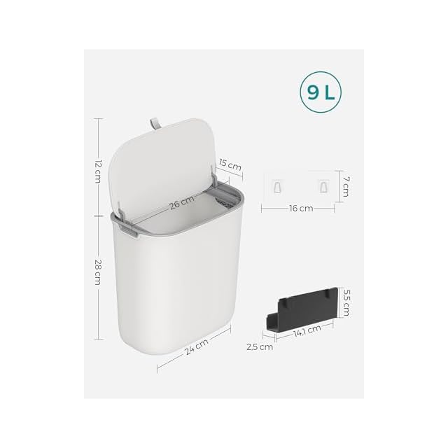 SONGMICS ゴミ箱 ひっ掛ける キッチン 生ゴミ収納 9L 吊り下げ式ダストボックス ふた付き スライド式 密閉 防臭 食器棚/キャビネット/シンク/バスルーム/車内/オフィス/トイレ用 ホワイト おしゃれ LTB820W9