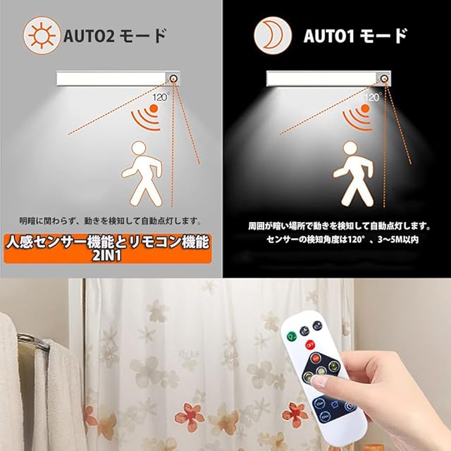 【LEDバーライトの三つ照明モード】①常時点灯モード:非常時やアウトドア、停電時などに点灯し、懐中電灯としても使用できます。 ②ナイトセンシングモード:暗い場所でのみ使用しき、より省エネです。③終日センサーモード:このモードは、あらゆる環境で機能します。センサーの検知角度は120°で、3~5M以内の動作を感知すると自動的に点灯し、20秒後に動きがないと消灯します。