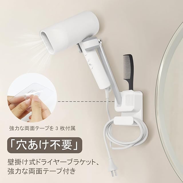 ヘアドライヤーホルダー 壁掛け 調整可能 ドライヤーホルダー ケーブルハンガー付き ドライヤー置き 両手解放 体力節約 バス用品(ホワイト)