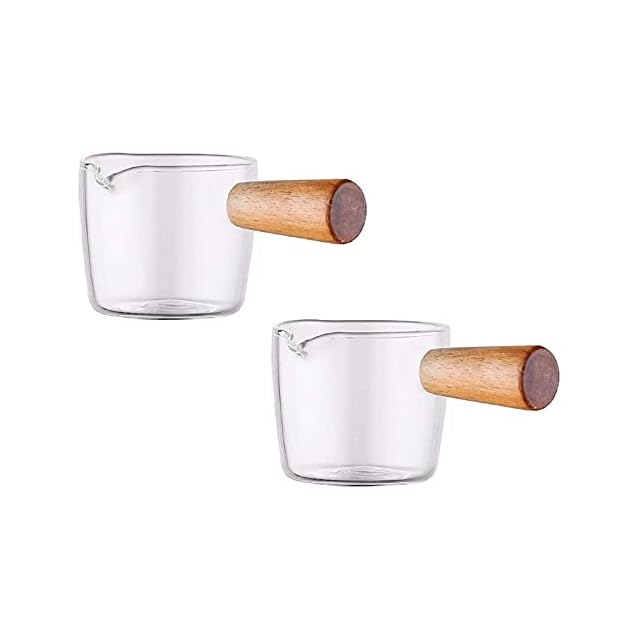 Haskoss 2個の木製ハンドル付き透明なガラスクリーマー 小さなミルクカップ ハンドル付き ミルクジャグ コーヒーミルクカップ ミルクピッチャー ミニコーヒーミルククリーマーピッチャー 50Ml
