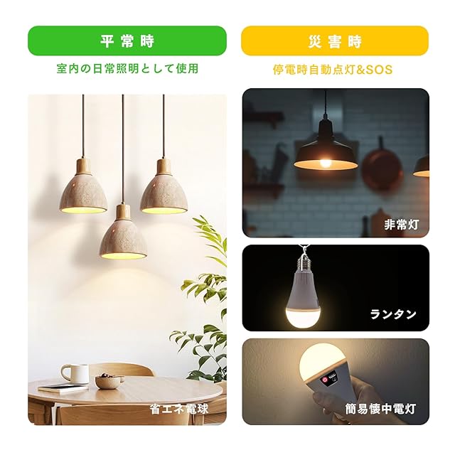 本製品は一般社団法人「フェーズフリー協会」によって認定された、日常使いの照明と災害対策を両立する「フェーズフリー製品」の防災電球です。<br> 普段は、便利な赤外線リモコン操作対応のLED電球として使用ができ、点灯している間に自動で内蔵バッテリーに蓄電がされます。そして、地震や悪天候などの予期しない停電が発生した際に、自動で検知し、素早くパッと点灯! 最大で9時間非常灯として使用ができ、停電の暗闇に伴う不安や危険から解放し、家族の安全を守ります。<br> また、電球を照明器具から取り外し、付属のスイッチ付き吊下げフックを用いてランタンとして使用したり、手持ちで簡易懐中電灯としてもご使用いただけます。赤外線リモコン操作は、通電時・停電時を問わず、ON/OFF切替、3色調色、9 段調光、常夜灯、タイマー、SOS設定に対応しています。<br> 明るさの目安:60W形相当(消費電力9W)<br> 口金サイズ:E26(E27兼用、海外利用可)<br> 内蔵バッテリー:2600mAh(満充電5-6/8-12時間)<br> 停電時点灯時間:約9時間<br> LED設計寿命:40000時間(期間2年)<br> 配光角:180度<br> 放電・充電上限:約500回<br> 本体寸法:139*68mm<br> 製品重量:103g<br> 充電方式:AC/USB 5V/1A<br> 通常時明るさ:810lm<br> 停電時明るさ:360lm<br> 入力電圧:AC90~240V<br> 3色調色:電球色・昼白色・昼光色<br> 9段調光:100lm-810lm<br> 同梱付属品:赤外線リモコン&ケース、簡易吊り下げフック、USB充電ケーブル<br>