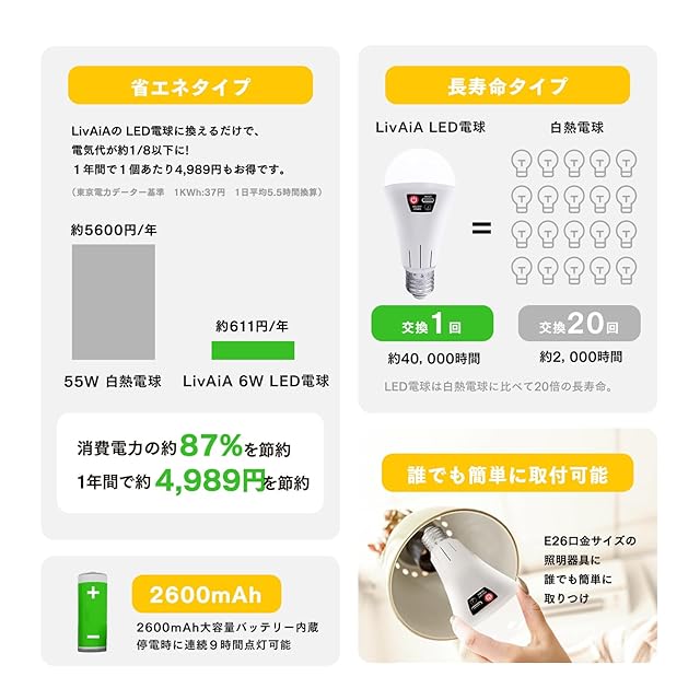 LivAiA! USB外部充電・リモコン操作、調光・調色タイプ防災LED電球、9W・60W形相当 3色調色・9段調光・常夜灯・SOS発信 2600mAhバッテリ一内蔵 停電時に9時間自動点灯 停電・地震・台風対策 リモコンケース・ランタン用吊り下げフック・充電ケーブルセット付き フェーズフリー認証・防災製品推奨マーク取得 FF01-B