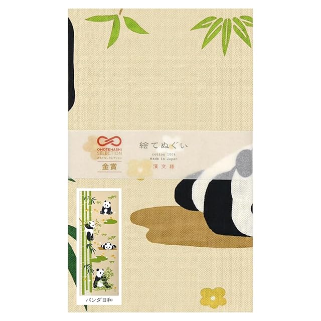 【パンダ日和】<br> 笹を食べたり、ごろごろしたり。<br> のんびり、ゆっくり、のどかなパンダの休日。<br> <br> 【絵てぬぐい】<br> 1枚の絵としてお飾りいただける「絵てぬぐい」は、<br> てぬぐいとしてはもちろん、季節感あふれるインテリアとしても好評です。<br> 横浜の粋と遊び心を持つ濱文様らしさに溢れた「絵てぬぐい」を是非お楽しみください。<br> <br> ◆素材:綿100% (厳選した木綿生地を採用しています)<br> ◆サイズ:約34cm×90cm (布の伸縮により多少の誤差があります)<br> <br> 【製品仕様】<br> ・横浜伝統の型染め手法である ”捺染 (なっせん)” でお作りしています。<br> ・柄のプリントは片面 (表) のみとなっております。<br> ・端を縫わない ”切りっぱなし” 仕様の、昔ながらのてぬぐいです。<br> ・ほつれは自然と止まりますので、適宜ハサミでカットしながらお使いください。<br> <br> 【注意事項】<br> ・色合いはご覧頂く環境によって印象が異なる場合があります。<br> ・濃色は色落ちする場合がありますので、単独での手洗いを推奨しております。<br> ・塩素系漂白剤はご使用にならないようお願いします。<br> ・濡れたまま重ね合わせたりすると色が滲む場合がありますのでご注意ください。<br> ・素材の特性上、洗濯をすると多少縮みます。<br> ・額装する場合は水通しせず、アイロンと霧吹きでシワを伸ばしてお飾りください。<br> <br> 【ブランド】<br> 横浜のテキスタイルブランド「濱文様」(はまもんよう) は、<br> 横浜伝統の型染め手法である ”捺染 (なっせん)” で染め上げた色あざやかな「てぬぐい」や<br> 風呂敷・タオル・ハンカチなどを中心に、数多くの和雑貨を企画・製造・販売しています。<br> <br> 遊び心のある個性的なデザインが特徴で、<br> 四季折々の風情を感じさせるオリジナルデザインを発信し続けています。<br>