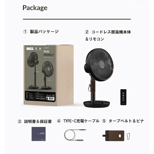 メディアでも今、大注目の今季必需品!【朝日新聞でも紹介されました】 LUMENA FANシリーズ累計販売1,200万台突破!! クラウドファンディングにて驚異の1,300万円を突破し、大好評だった前作モデルFAN PRIMEがさらにパワーアップしました! 電気代の高騰と猛暑に悩まされるこの夏。それらすべてをFAN PRIME2一台で乗り越えられます!! コードレス扇風機として約30時間使用可能(風量1段の場合)/大容量の8,000mAhバッテリー サーキュレーター式・リモコン付き、左右100度首振りや4段階タイマー機能付き 1ヶ月の電気代は約7円・高さ調節可能・約950gの軽量化・静音のDCモーター採用(20db) 【FAN PRIME2だけの強み】 1.羽根のつなぎ目とDCモーターを強化(振動-バランス改良による風量、騒音、効率改良効果) 2.MAX風速10Wで、風量が約20%アップ 3.静音性が約10%アップ 4.消費電力が約10%ダウン(1段階使用時) 5.バッテリー持続時間が約20%向上(1段階使用時) 6.操作ダイヤルのカラー変更 7.付属品(タープベルト)追加:掛けて使えるので、アウトドア環境でもより使いやすく便利に