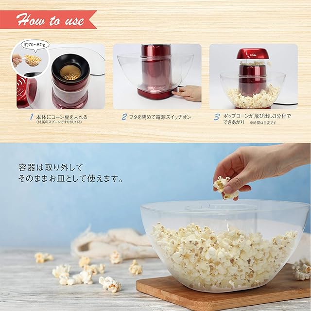 電源式で、テーブルでそのまま作って食べられる、本格派ポップコーンメーカー。コーンを入れてスイッチを押すだけ。約3分で出来上がり。お子様のおやつから、みんなで楽しくパーティに。