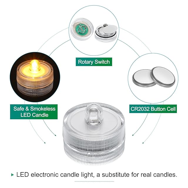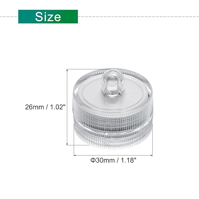 パッケージ内容:ティー ライトキャンドル12個とCR2032ボタン電池2個;製品寸法:30mm x 26mm/1.18inch x 1.02inch (D*H);素材:PS外殻;ベース形状:ラウンド;外殻の色:透明;光の色:黄色。